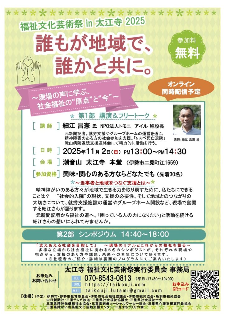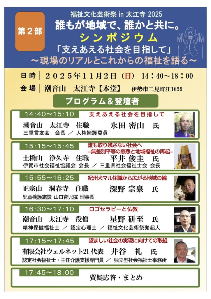 内容 | 【三重県内の福祉施設の皆様の作品展示とバンド演奏、福祉事業所の販売など】 太江寺は、地域に根差すお寺として、地域福祉の方や地域の皆様との繋がりを大切にしながら、広く皆様に楽しんで頂ける場を設けさせて頂きました。 〇11/2~11/3 三重県内の福祉施設等の皆様が準備された作品展示及び販売 〇11/2(日)【社会福祉をお寺発信】特別講演会・シンポジウム(下記チラシ参考) 〇11/3(月・祝)音楽村ゆい によるバンド公演やリハビリ体操 【詳細はこちら(公式ページ)】 |