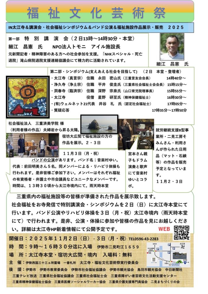 名称 | 福祉文化芸化祭 in 太江寺&講演会・社会福祉シンポジウム&バンド公演&福祉施設作品展示・販売 2025 |